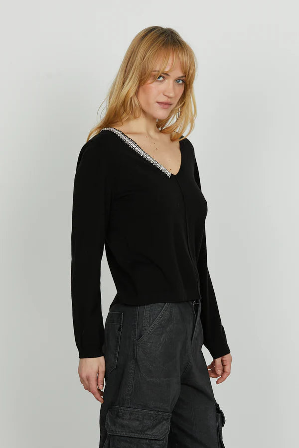 RELISH Maglia LEVITA manica lunga scollo v con applicazione perline più strass