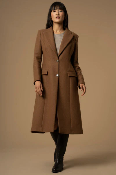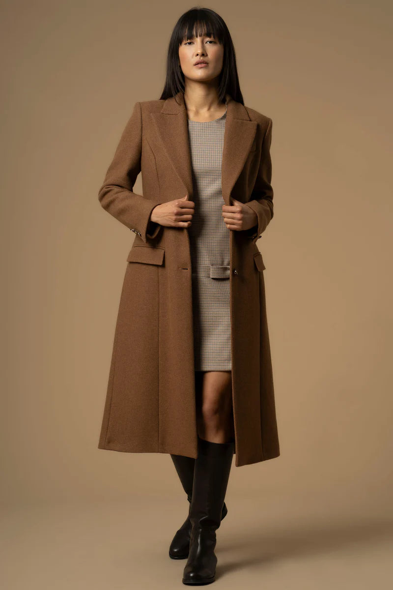 Stile elegante e intramontabile epr questo cappotto caratterizzato dallo scollo con revers, tasche con pattina sul davanti e chiusura con due bottoni decorati.