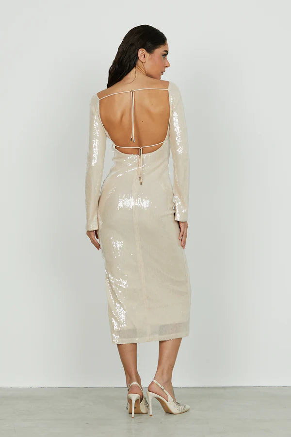 Abito lungo MISMA a maniche lunghe, interamente ricoperto di paillettes per un effetto luminoso e scenografico. Perfetto per serate speciali o occasioni in cui brillare è d’obbligo.
