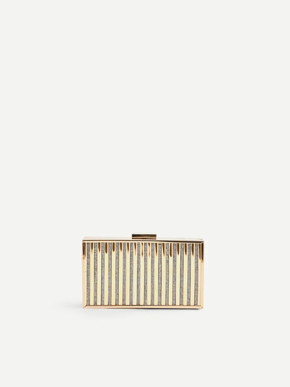 Il suo design rettangolare, modello box clutch, è realizzato in metallo con finitura argento lucido. La superficie è interamente percorsa da un elegante motivo a righe verticali, che alterna fasce di metallo liscio a canali impreziositi da un fitto pavé di strass color cristallo. Questa lavorazione crea un suggestivo gioco di riflessi ad ogni movimento, donando dinamismo all'accessorio. La cornice liscia e la chiusura a scatto superiore, anch’essa rettangolare, completano la struttura con un tocco minimale e contemporaneo.