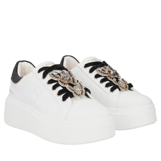 Stile ed eleganza per questa sneaker in pelle di colore bianco e nero. Dotata di morbida imbottitura e suola platform alta 5 cm, saprà accompagnarti con leggerezza e comodità tra i tuoi impegni quotidiani. Le originali applicazioni a forma di farfalle gioiello poste sui lacci impreziosiscono il modello, aggiungendo un tocco di femminilità ai tuoi look. Il logo dorato applicato sulla linguetta completa il design di questa sneaker in pelle creata per farti brillare.