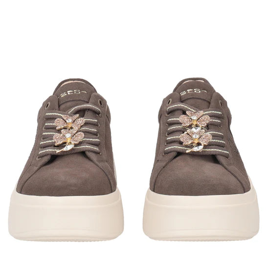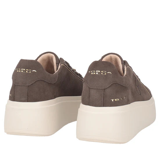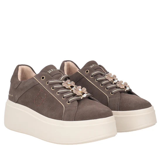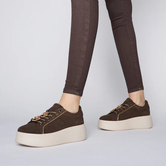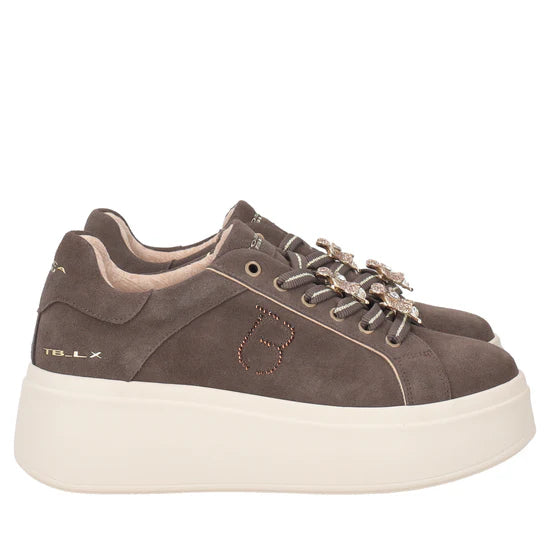 Lasciati conquistare dal fascino scintillante della sneaker in suede con fiore gioiello della nuova collezione Tosca Blu. Realizzata in morbida pelle scamosciata color testa di moro e dotata di suola platform alta 5 cm, è impreziosita da un delicato fiore gioiello che illuminerà ogni tuo passo. Questa sneaker in suede è perfetta per aggiungere un tocco di eleganza ai tuoi outfit quotidiani.